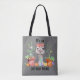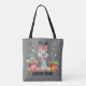 This tote bag features an adorable ostrich who wears a red and white bow and eye glasses behind a row of colourful potted house plants and fruit. The black text above and below the image says "It's an Ostrich Thing". The image and text are placed on a medium grey background on both sides of the bag.