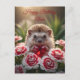 A cute hedgehog holding a red garnet heart sits in a patch of red and white carnations.
