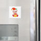 Cute jolly Christmas elf Magnet. Cute baby elf holding a gift box.