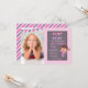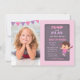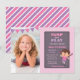 This invitation a cute little girl with ponytails jumping happily on an invitation designed to look like a giant trampoline. Bunting flags decorate the photo side of the invite. Perfect for a indoor playground or trampoline park party! Colour palette of pinks and purples makes this invite great for birthday girls! Personalise easily with your party details. To fine tune the photo to the best position, switch to customise mode and move the photo accordingly,