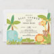 Adorable baby shower invitation featuring the sweetest elephant, giraffe, monkey, lion & alligator set on a pale yellow background with palm trees.