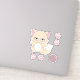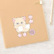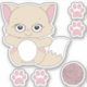 Cartoon themed sheet of stickers, with cute Kawaii style kitten, paw prints and a ball of yarn done in tan, pink and white.