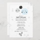 Simple and chic, this Baby Shower invitation design is the perfect way to invite your sister's, daughter's, or friend's baby shower. Features stars and constellation background with a cute, blue kawaii planet with moons, rocket ship, and the stars and constellations on the back. All grey typography is changeable to fit your party planning needs. Has matching accessories to fit your space-themed celebration needs. This design is perfect for any gender-neutral party.