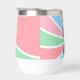 Cute skunk holding a boba or bubble tea Kawaii cartoon. PPink, green and blue background.