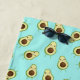 Adorable avocado patterned beach towel features an allover pattern of smiling and winking kawaii avocados in a cartoon style, on a bright summery turquoise background. A cute and trendy design that's perfect for avocado lovers or kawaii fans, you can personalise this quirky chic beach towel with a name along the bottom.