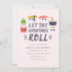 Let the good times roll! Sweet birthday party invitation featuring cute kawaii sushi rolls against a pastel pink background.