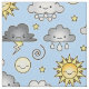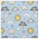 This fabric pattern includes a variety of cute weather icons with smiley or frowny faces in kawaii style: a sun, moon, white cloud, rain cloud, snow cloud, lightning thunderstorm cloud, and stars. Perfect for weather enthusiasts, meteorologists, storm chasers and climate scientists!