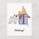Cute Keeshond Puppy and Kitten Christmas Postcard. Keesie puppy looking at an orange tabby cat on a Christmas package. An adorable Xmas postcard for dog lovers.