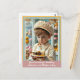Artsy postcard with unique illustration, featuring cute little child handing out various delicious gourmet bites, sweets on a plate.