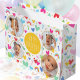Celebrate the magic of turning one with this cute personalised gift bag! A fun and colourful design featuring four of your favourite photos and lots of rainbows, hearts and stars. The phrase "Happy Birthday" and the recipient's name are in the middle, and the all-important birthday age is repeated throughout the pattern. This custom template is perfect for kids' 1st, 2nd, 3rd, 4th or 5th milestone birthdays. Printed colours: bright and pastel hues, with pink, red, yellow, green, blue and white. Shop the online collection for more popular product ideas for children's birthday celebrations!