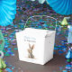 These cute paper favour boxes with little bunny on the front are perfect for your baby boy's birthday party! Just add your kid's name.