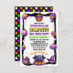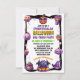 This editable Kid's Halloween Party Invitation Card features cute monsters, pumpkins, and treats in purple, orange, pink and eerie green on a white background. It's perfect for a Spooktacular birthday party for a boy or girl, or any other children's Halloween party or event.