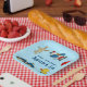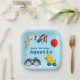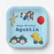 Personalised this cute kid’s birthday party paper plates, featuring adorable retro toys including a classic red blue white aeroplane, blue yellow race car, red balloon, yellow duck, white stuffed animal bunny.