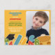 Cute Kindergarten graduation party invitation postcard. School bus yellow background with graphical school supply icons. Large central photo (placeholder to be replaced). Modern whimsical typography in multiple colours pulling from card details. Sophisticated yet youthful. Cute graduation announcement and invitation. Great keepsake announcement of a spectacular step in one's educational journey.