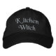 A cute pretty, purple embroidered, black baseball cap with the text Kitchen Witch. It can be personalised. A cool modern witch hat gift idea.