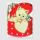 This vintage image is a sweet little white kitten holding a heart, peeking out of its red box. A vintage valentine's day card that is cute for any time of the year.