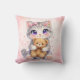 Bring a little extra sweetness and comfort into your space with this adorable kitten throw pillow. Featuring a fluffy grey kitten with sparkling purple eyes hugging a cosy teddy bear, this charming design sits on a dreamy pink watercolor background with soft sparkles that create a magical storybook feel.
