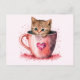 A postcard with a cute little kitten. Sitting in a teacup looking positively adorable. One little paw hangs on the brim. Hearts swirl all around. Sweet and whimsical.