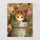Adorable orange kitten emerging from a pottery pot amidst lush leaves and colourful flowers, creating an artistic and whimsical setting.