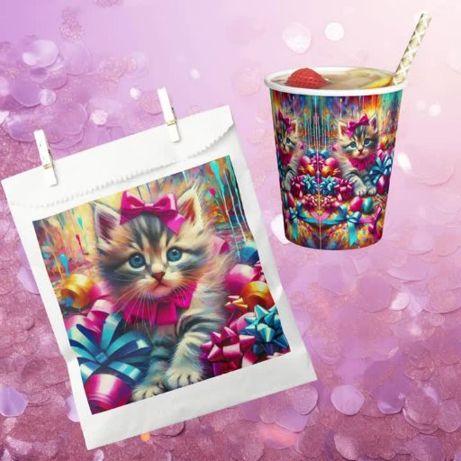 Cute birthday kitten playing in bows and ribbons. Colourful pink and blue ai art.