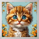 Cute orange tabby kitten with big blue eyes, surrounded by delicate flowers and vibrant greenery, set against a light blue background.