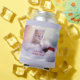 A can cooler with a photograph of a ginger kitten sitting on a soft white and red Santa hat. Blurry glittering lights bokeh background.