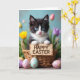 Designed with a close-up view of a tiny black-and-white kitten peeking out from a rustic woven basket, the scene draws you in with bright blue eyes and a curious tilt of the head. Its fluffy fur catches soft, diffused light, and its white paws hold a small wooden plaque as if offering a sweet note to a friend. Centered on the plaque is a short festive greeting in simple lettering, painted in a dark tone that stands out against the warm wood. In the foreground, several pastel eggs with delicate patterns sit near the basket, adding gentle color and a cozy, shared-moment feel. Behind them, blurred tulips in sunny yellow, tender pink, and lavender create a romantic garden haze, like a quiet walk taken together 🌷. The background fades into a calm sky-blue wash that keeps the focus on the kitten’s tender, inviting gaze 🐰. The basket’s woven texture is clearly visible, with soft shadows falling along the rim and across the patterned eggs.