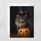 This adorable cute fluffy kitten proudly places a paw on the Halloween pumpkin in this vintage and baroque-inspired oil painting.