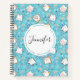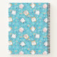 Spiral notebook with a cute cat pattern, set on a blue background and decorated with rainbows and paw prints and more.
