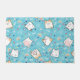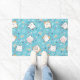 Door mat with a cute cat pattern, set on a blue background and decorated with rainbows and paw prints and more.