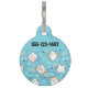 A pet tag with a cute cat pattern, set on a blue background and decorated with rainbows and paw prints and more.