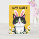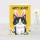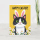 This greeting card features a stylised black-and-white tuxedo cat centred on a rich marigold-yellow background, looking straight ahead with wide green eyes that feel like an inviting glance between friends. Tall bunny-like ears sit on its head, with soft pink inner details that add a gentle, affectionate touch 🐰. A small rosy nose and a simple curved mouth give the cat a calm, sweet expression, like it’s quietly sharing a warm hello. Across the top, a seasonal greeting appears in dark lettering, placed high and easy to read against the yellow. Along the bottom edge, a row of white, daisy-like flowers with yellow centres stretches across, with thin green stems that lightly frame the scene 🌷. The strong contrast between the cat’s dark patches and the bright background makes the character stand out without any extra clutter. The lower border shows clustered white petals and sunny yellow centres, with slender green stems rising just above the bottom margin.