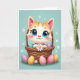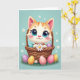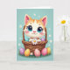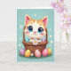 On the front of the card, an animated-style orange-striped kitten with oversized blue eyes sits snugly in a woven basket, its cheeks softly blushed as it gazes out with a tender, friendly look. The kitten’s small paws hold a white daisy close, like a quiet little gift offered to someone special 🌷. The basket is packed with speckled, brightly coloured egg shapes, and a few have tumbled onto the green grass below, adding a casual, shared-moment feel. Behind the scene, a pastel blue background glows with gentle light and is dotted with tiny white blossoms that float like spring confetti. Near the top, a short Easter greeting appears in rounded lettering, set in white with a light pink outline so it stands out against the sky-blue backdrop 🐇. Subtle shading gives the fur and basket texture a soft depth, while keeping the overall look light and airy. At the bottom edge, the grass blades overlap the scattered eggs, and the basket’s braided rim is detailed with small cross-weave lines.