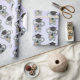 Wrapping paper with an illustration of a cute grey koala eating some eucalyptus leaves, wearing a fancy black graduation cap. Set on a light purple digital watercolor background.