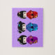 On this item, you see 3 cute kawaii kokeshi dolls on a purple background.