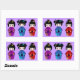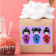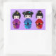 On this item, you see 3 cute kawaii kokeshi dolls on a purple background.