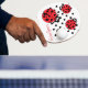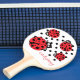 Happy cartoon ladybugs, complete with red backs with black spots, crawl across a black and white polka dot background on this cheerful ping pong paddle. The text, in red, says LadyBug. Cute for anyone who loves the ladybug!
