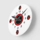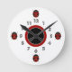Cute ladybug wall clocks with red black and white colours with little ladybugs on the clock face in this colourful wall decor animal clock design for your kitchen, bathroom, or any room in your house you want to add some colour and character. Great for kids rooms or modern kitchens.