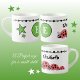 On this drinking cup there are cute red and black ladybirds and a dot pattern, with green elements.