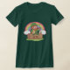 A cute doodle of a leprechaun seated on a wooden log and playing on the banjo with a rainbow and clouds in the background. Adorable and colourful design for St. Patrick's Day!