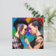 Two beautiful woman in love lesbians lgbtqia+ couple with rainbow background. One woman playing with the other women's hair.