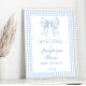 Explore sophistication with our elegant preppy baby boy shower welcome sign poster, adorned with a charming baby blue bow ribbon set against a backdrop of classic gingham pattern. Perfect for welcoming guests to your celebration with style and refinement.