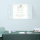 Cute classic preppy baby boy shower welcome sign banner featuring charming stork carying a baby boy in blue sack on vintage styled floral crest.