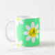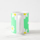 This adorable mug features white flowers with a soothing light green background. Single initials for personalisation can be placed in the centre of a flower on front and back. It's a sweet and happy cup to use for beverages.
