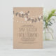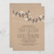 cute rehearsal dinner invitation features string of lights hanging on the tree branches with white flowers and blossoms. Casual look, romantic kraft paper style background texture invitation for modern yet vintage rehearsal dinner. Perfect invite for rustic country barn dinner, outdoor rehearsal dinner or for bride and groom who are planning wedding reception in their's backyard or garden.