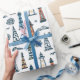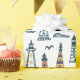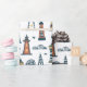 Cute lighthouse pattern in various styles and shapes on white background. Simple drawn seagulls, swirly clouds and waves in design too.