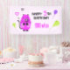 Cute lilac cat on pink background with hearts and balloons for birthday party