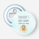 Baby shower favour, bottle openers with a cute watercolor illustration. An adorable lion wearing a crown fishing for stars sitting on a crescent moon resting on a fluffy cloud. Magical fantasy illustration. Light blue watercolor background.
