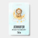 A name tag with a cute watercolor illustration. An adorable lion wearing a crown fishing for stars sitting on a crescent moon resting on a fluffy cloud. Magical fantasy illustration. Light blue watercolor background.