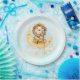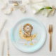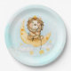 Paper plates with a cute watercolor illustration. An adorable lion wearing a crown fishing for stars sitting on a crescent moon resting on a fluffy cloud. A bunch of faux gold foil stars by the clouds give it a magical feel. Light blue watercolor background.